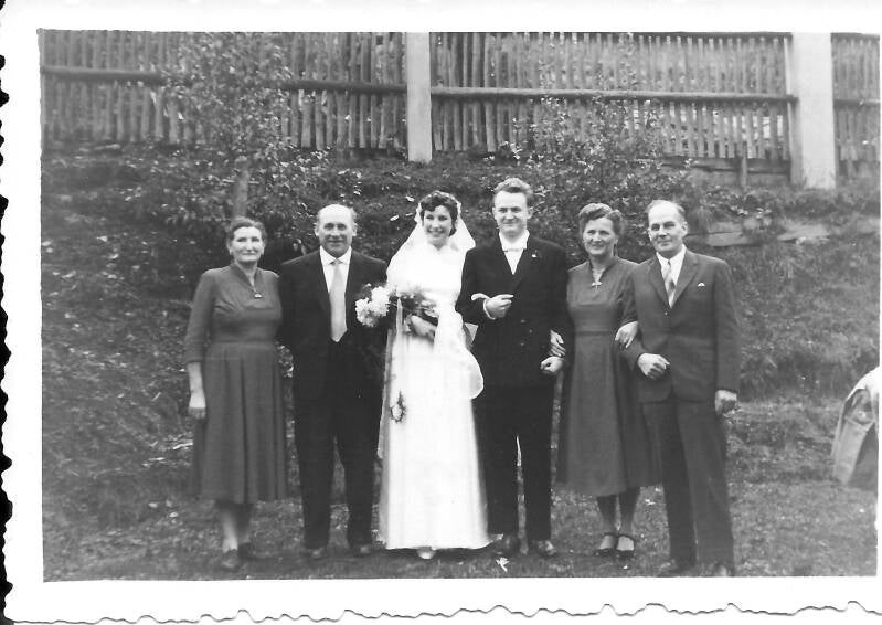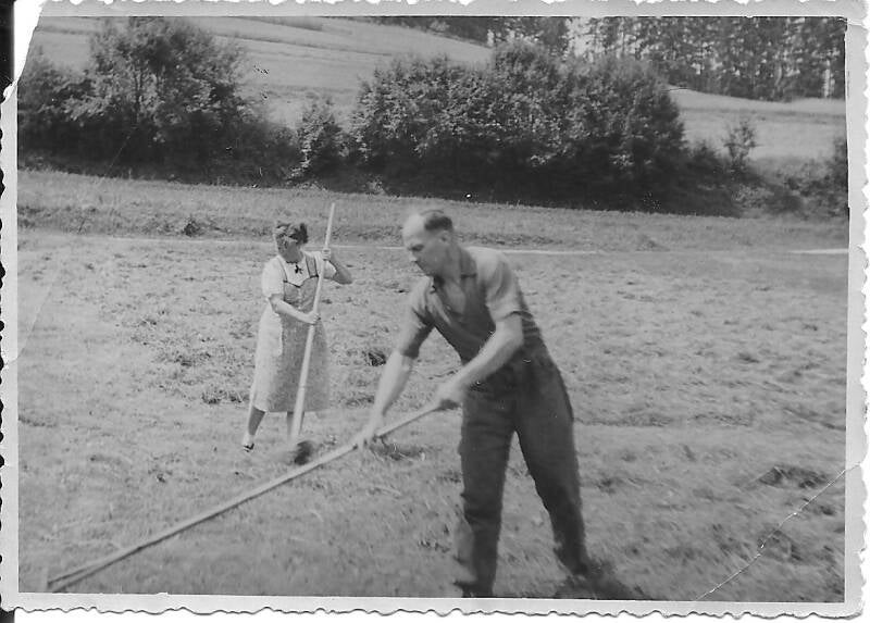 Von Paul und Frieda gibt es noch zwei weitere Fotos - auf nachstehendem Foto von der Hochzeit ihres Sohnes Bruno Hofmann im Jahr 1958 sind sie rechts stehend zu sehen. Das zweite Foto zeigt beide bei der Heuernte.