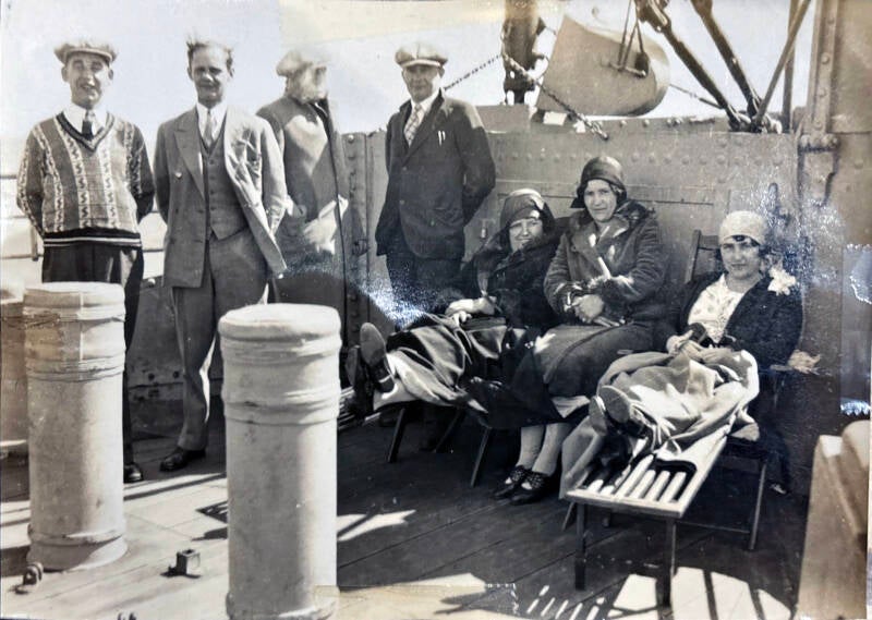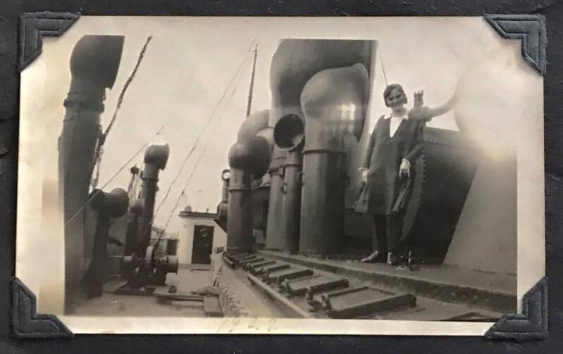 Erich Krausser, der Bruder von Frieda, emigrierte am 11.12.1926 mit dem Schiff Berlin in der 3. Klasse von Bremen nach New York. Zu diesem Zeitpunkt war er 19 Jahre, ledig, als Beruf wird für ihn angegeben Schmied, Geselle. Seine spätere Frau, Emmy Hedwig Ida Irmischer, geb. am 7.1.1907 in Schwarza, emigrierte zusammen mit ihrem Vater Johann August Irmischer am 13.4.1927 mit dem Schiff Bremen in der 3. Klasse von Bremen nach New York. Auf nachstehendem Foto von 1924 ist Hedwig auf dem Schiff zu sehen.
