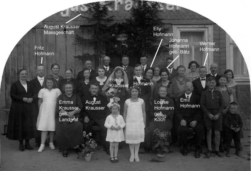 Nachstehend das Hochzeitsfoto von Paul und Frieda. Die mir bekannten Personen habe ich mit Namen gekennzeichnet. Ich gehe davon aus dass hier auch eine Reihe Personen aus der Familie Krausser zu sehen sind.