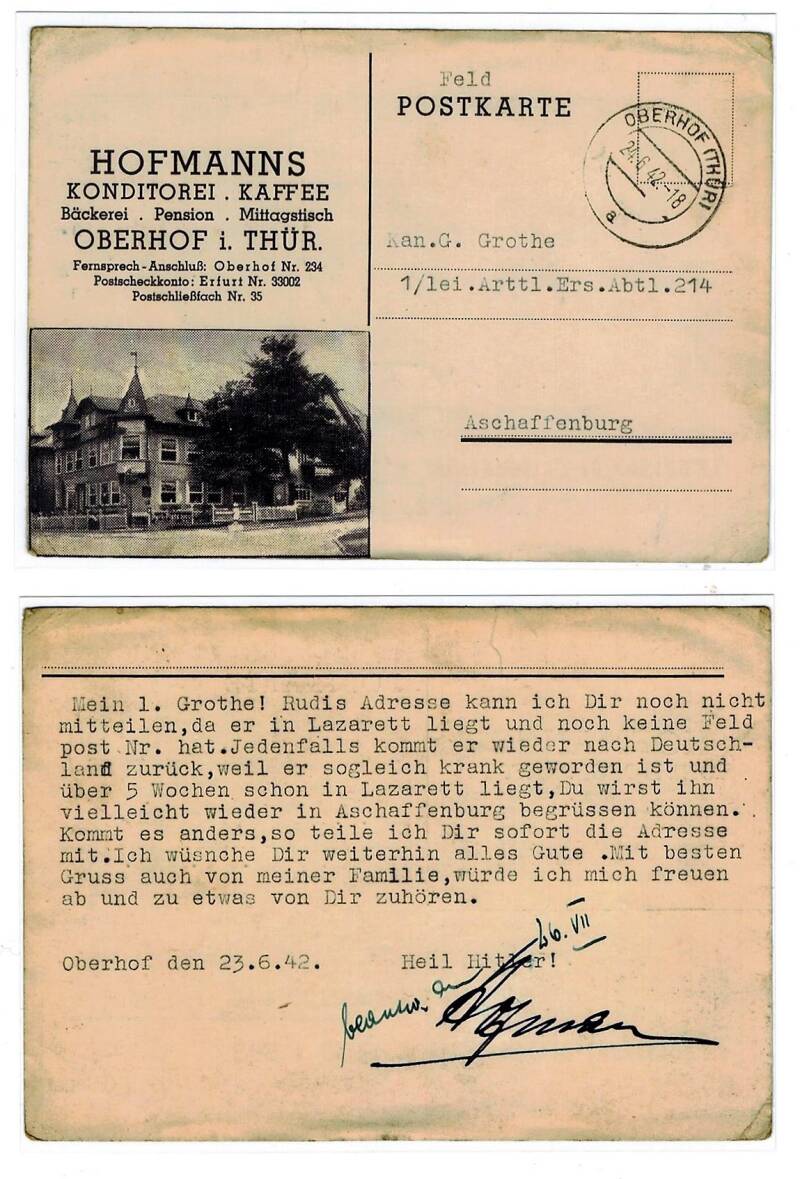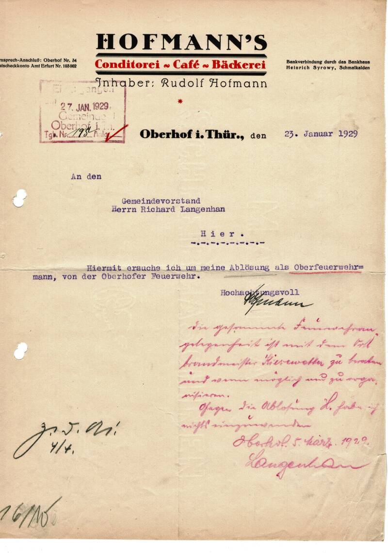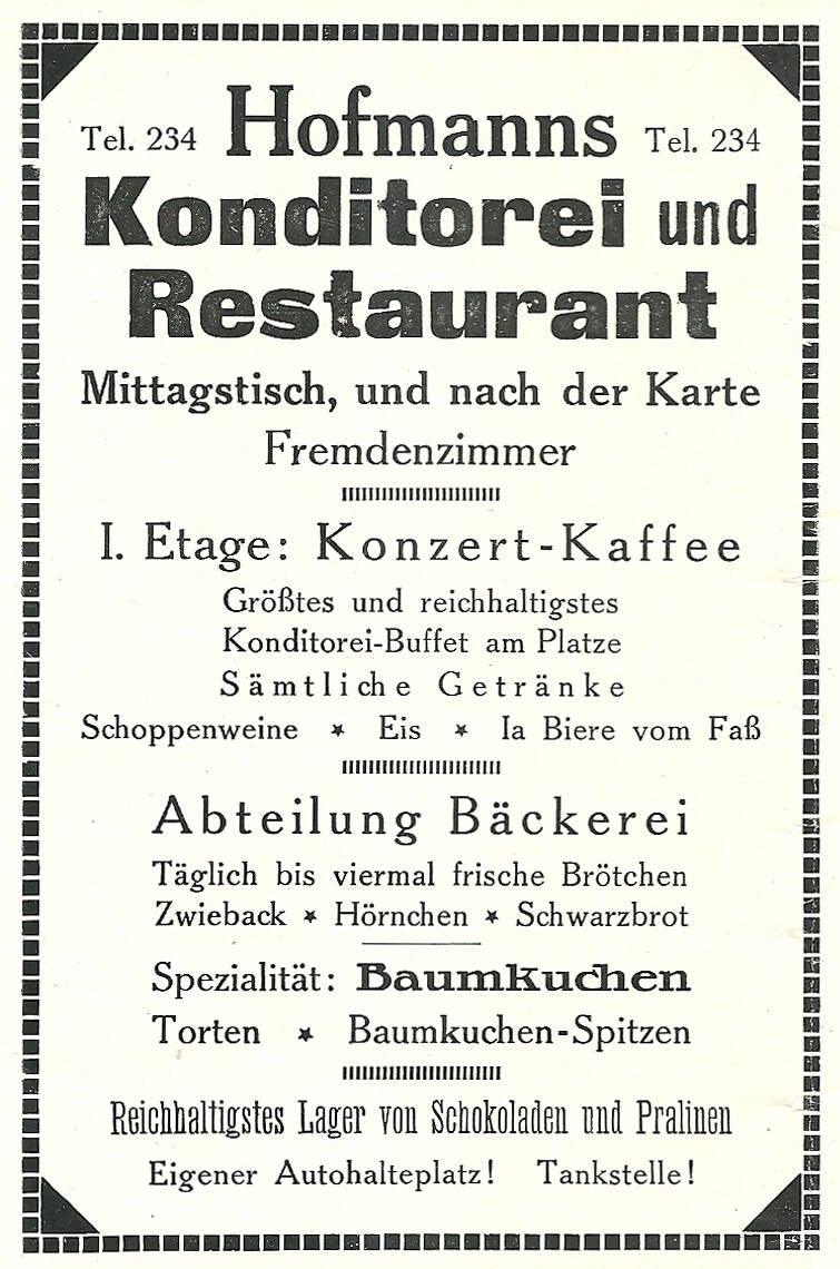 Im Grieben-Reiseführer für Oberhof von 1930 ist unter Pensionen folgendes aufgeführt: In der Zellaer Str. Nr. 29 Konditorei Hofmann, 10 Betten, 7-8 Mark, Zentralheizung. Außerdem noch einmal unter Restaurants und Cafes genannt: Konditorei und Cafe Hofmann, nachmittags und abends Konzert.
