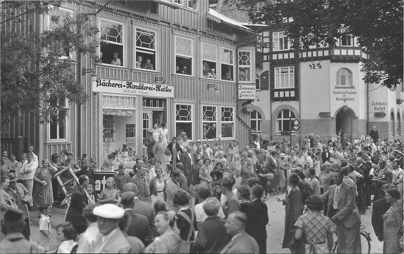 Diese Aufnahme ist zwischen Ende 1935 und 1939 entstanden. Die Menschen warten vor dem Cafe Hofmann auf Adolf Hitler, der zu diesem Zeitpunkt in der Oberen Schweizerhütte zum Mittagessen sitzt. Nach einem anschließenden kurzen Stopp in Oberhof fuhr er weiter nach Suhl in die Sauckelwerke (ehemalige Fa. Simson, ab November 1935 auf Fritz Sauckel, Reichsstatthalter in Thüringen, übertragen).