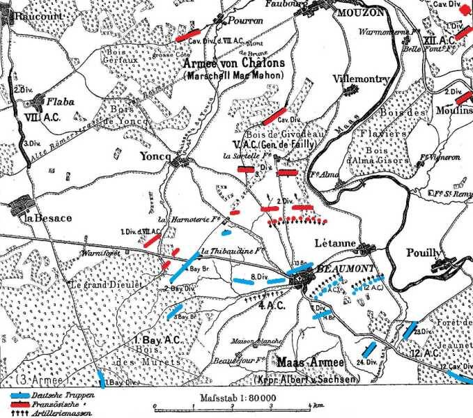 …Das IV.Korps war um etwa 10.00 von Nouart aufgebrochen. Offizierspatrouillien hatten dann das französische Lager und die fehlende Sicherung bei ihrer Erkundung bemerkt. General von Schöler ging daraufhin so geräuschlos wie möglich mit seiner 8.Division weiter vor. Die 4.Jäger besetzten leise die Höhe nördlich des Pachthofs Belle Bolee, während die 16.Brigade sich dann dahinter entwickelte. Die Artillerie nahm eine Aufstellung bei Beausejour. Doch plötzlich brach Alarm im Lager aus, den ein Landmann mit dem Rufen "Die Deutschen kommen" verursacht haben soll. Da nun keine Zeit mehr zu verlieren war, eröffneten die Geschütze das Feuer. Der Feind formierte sich jedoch trotzdem sofort in Linie und nahm die deutschen Spitzen nun ebenfalls unter Feuer. Auch ihre Batterien griffen umgehend in den Kampf ein, so daß sich die Verluste auf deutscher Seite mehrten. Ein Angriff auf den Pachthof konnte nur unter großen Mühen abgewehrt werden. Inzwischen hatte jedoch die 16.Brigade mit den Regimentern 86 und 96 die Höhen besetzt und dadurch der Artillerie Schutz gegeben. Bald kam auch die 15.Brigade mit den Regimentern 31 und 71 heran und auch die Korpsartillerie traf ein und vergrößerte die Geschützaufstellung.